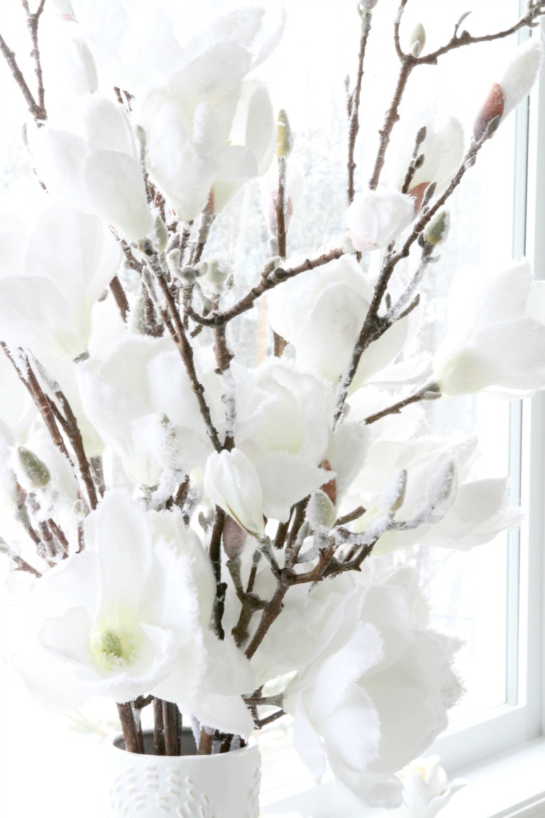 My white flocked magnolia still grace my “sideboard” (a white metal locker shelving unit from IKEA). They’ll stay here for a while longer before being replaced with something for spring, maybe pink flowered twigs or simple green leafy branches.