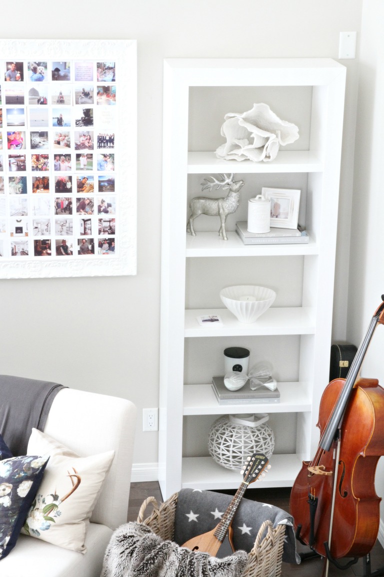 The more modern book shelf { on sale at 4Living years ago } is filled with neutral loves..a sea shell, an elk, books and candles and the photographs that were taken down to be replaced by new memories.