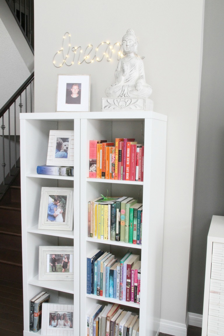Just around the corner is my buddha and a rainbow of books and family photos that get changed up now and then.