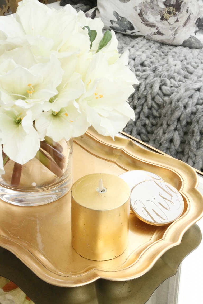 I love these gold Luminara candles! They were steeply discounted from Pottery Barn after Christmas because they were gold { ! } and were scratched. I plan to top them up with some gold leaf when I have a moment. At night they come on automatically and look so real and add such a calming peaceful presence to the darkened room.