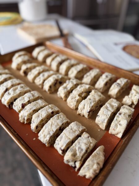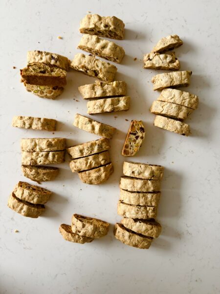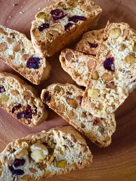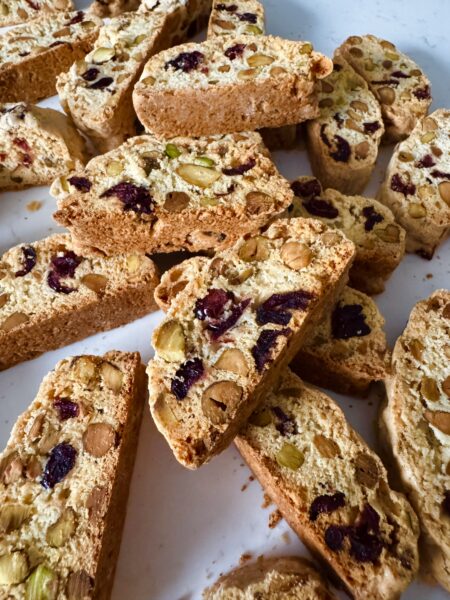 My daughter says that this is simply the best biscotti and I have to agree with her. It’s the only one I’ll bake. Biscotti means twice baked, so be careful not to overbake each time or your biscotti will be hard to bite into! I love the crunch of the pistachios and the chewy texture of the dried cranberries!
